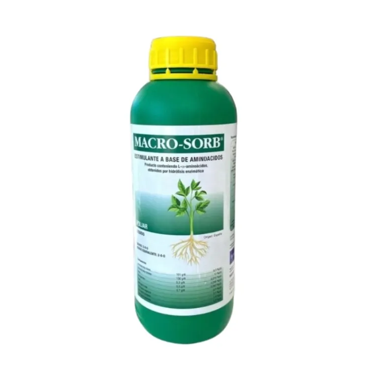 Macro-Sorb Foliar estimulante orgánico a base de L-aminoácidos de Hidrólisis Enzimática y otras sustancias bioactivas, para aplicación foliar, con una alta relación de aminoácidos libres respecto a totales (elevado grado de hidrólisis).