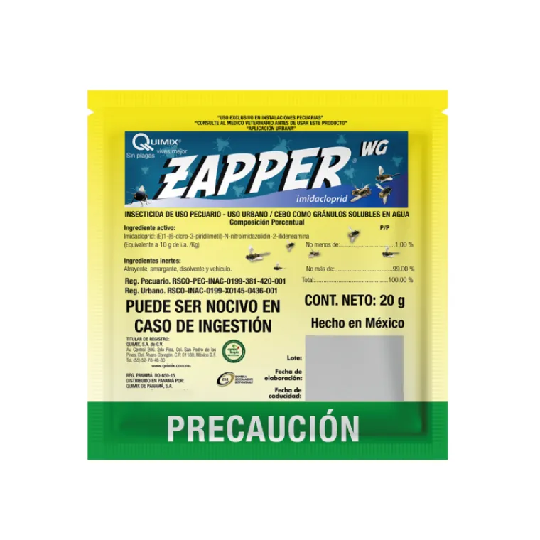 El imidacloprid presenta alta eficiencia como atrayente alimenticio y sexual, conocido como Z-9 tricoseno, específico de moscas. Su fórmula controla a las moscas