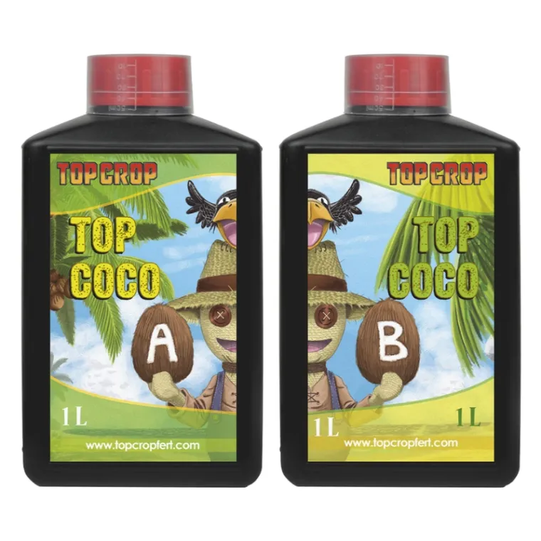 Top Coco A + Top Coco B son soluciones líquidas concentradas eficazmente formuladas y combinadas para la preparación de soluciones nutritivas aptas para su aplicación en sustratos orgánicos de coco.Se trata de un abono equilibrado que contiene los nutrientes principales, secundarios y micronutrientes necesarios para todos los ciclos de la planta.